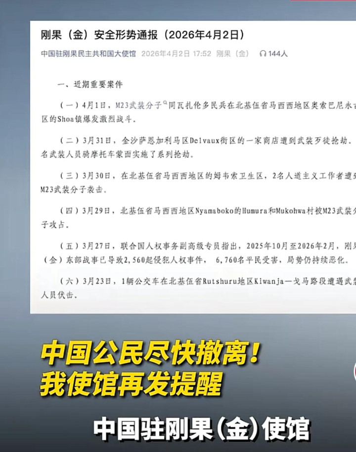 刚过清明,一条来自非洲的安全通报,瞬间揪紧了所有国人的心。中国驻刚果(金)使馆4月初接连发布重磅警告,措辞一次比一次严厉:东部四省极高风险,所有中国公民立刻撤离,非必要不前往9省,原地人员火速报备 。一句话,再不走,命都可能没了!
